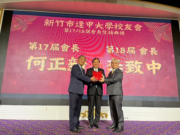 校友總會李明和總會長(中)監交,第17屆何正新會長(左)與新任李致中(右)會長進行交接。